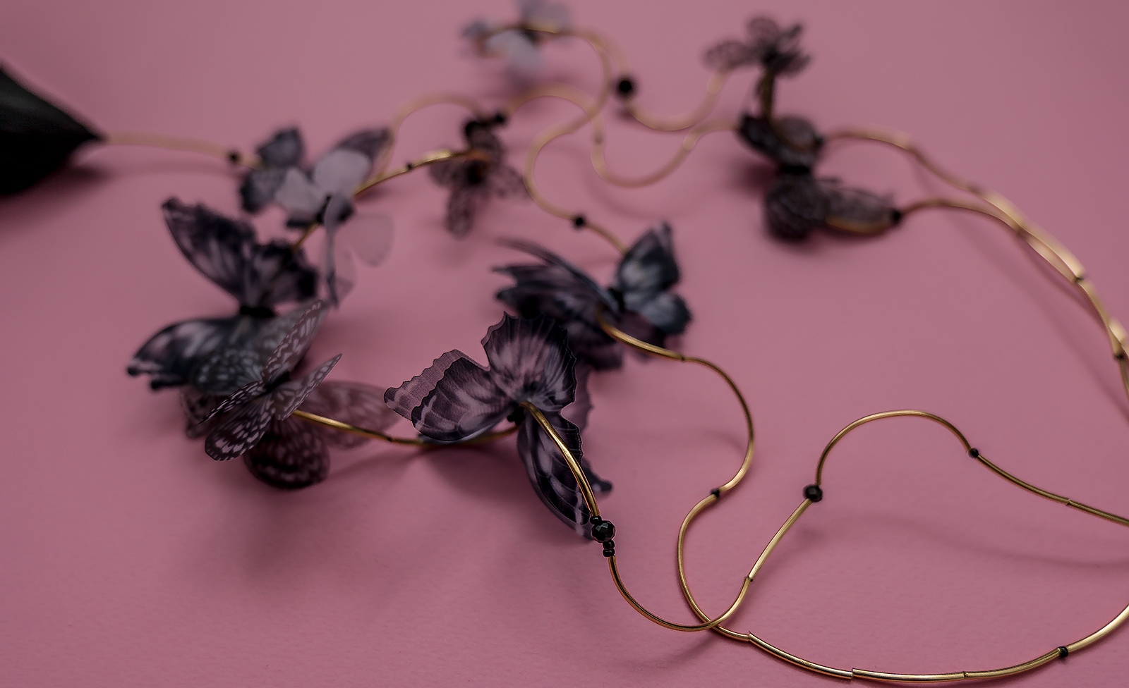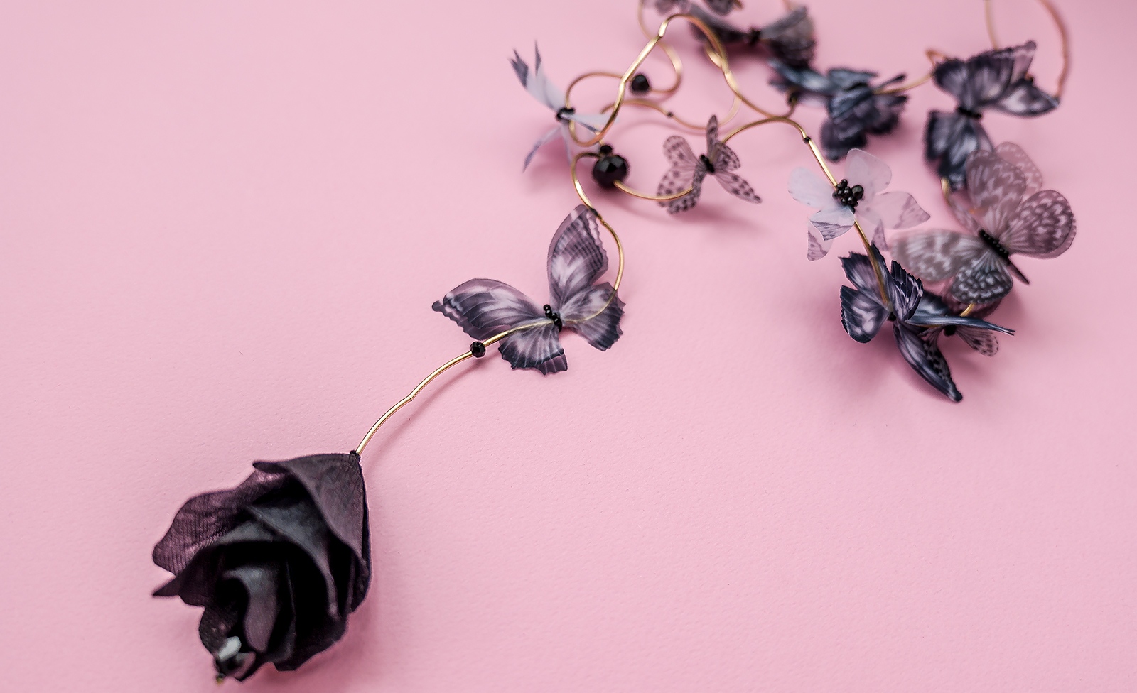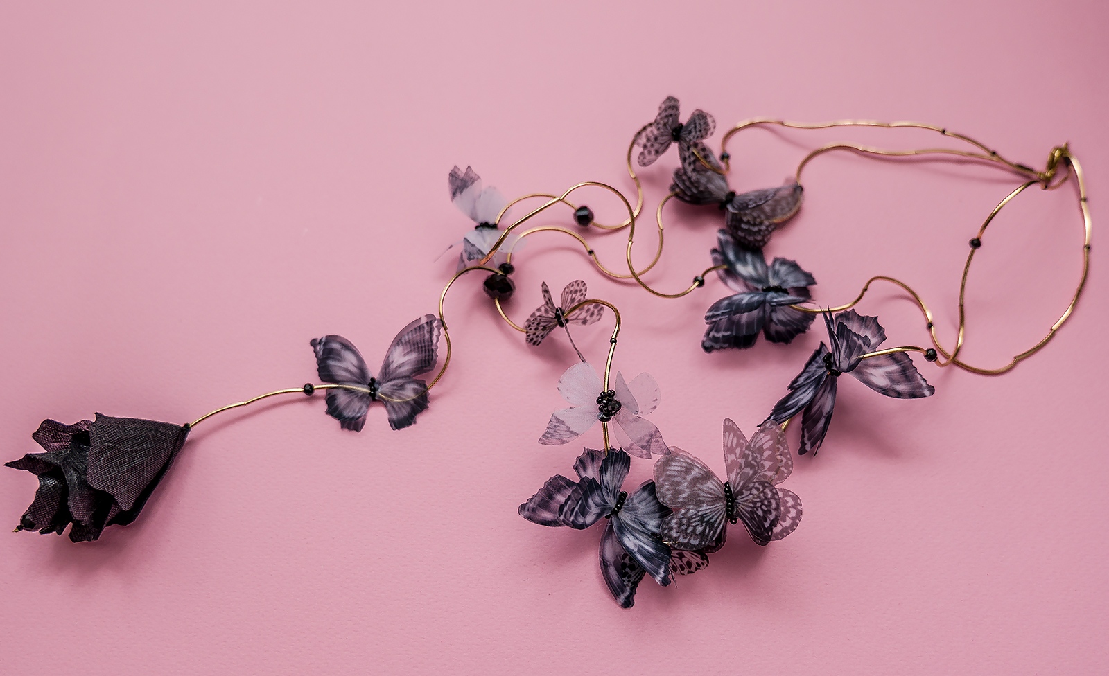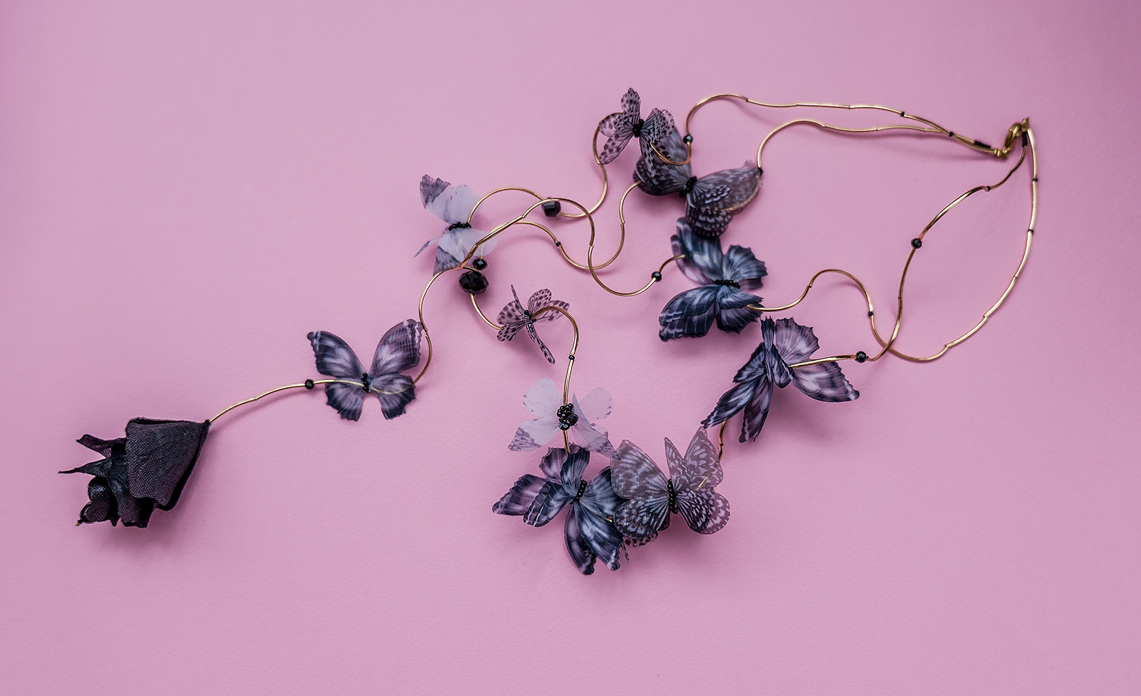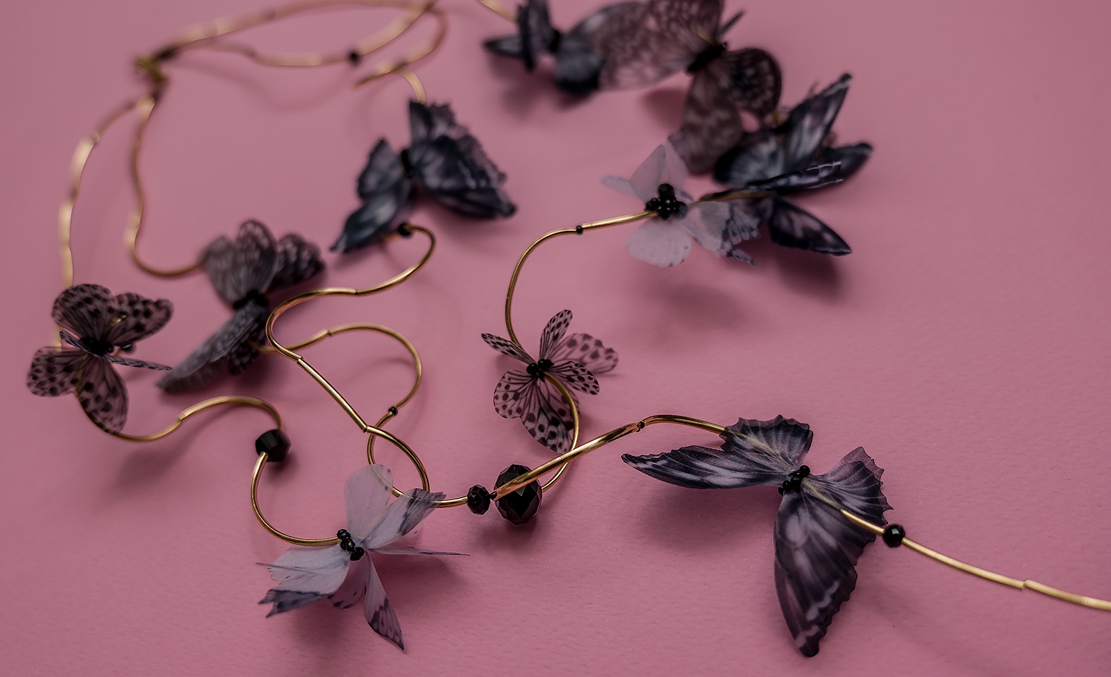 Вдъхновено от ефирната красота на природата, колие „Пеперудите“ на Arcobaleno е изящно бижу, което съчетава ръчна изработка с артистичен стил. Впечатляващите изкуствени пеперуди, обвити в златисти акценти, нежно се контрастират с дълбокия блясък на черни кристали. Елегантната метална закопчалка осигурява стабилност и комфорт при носене.