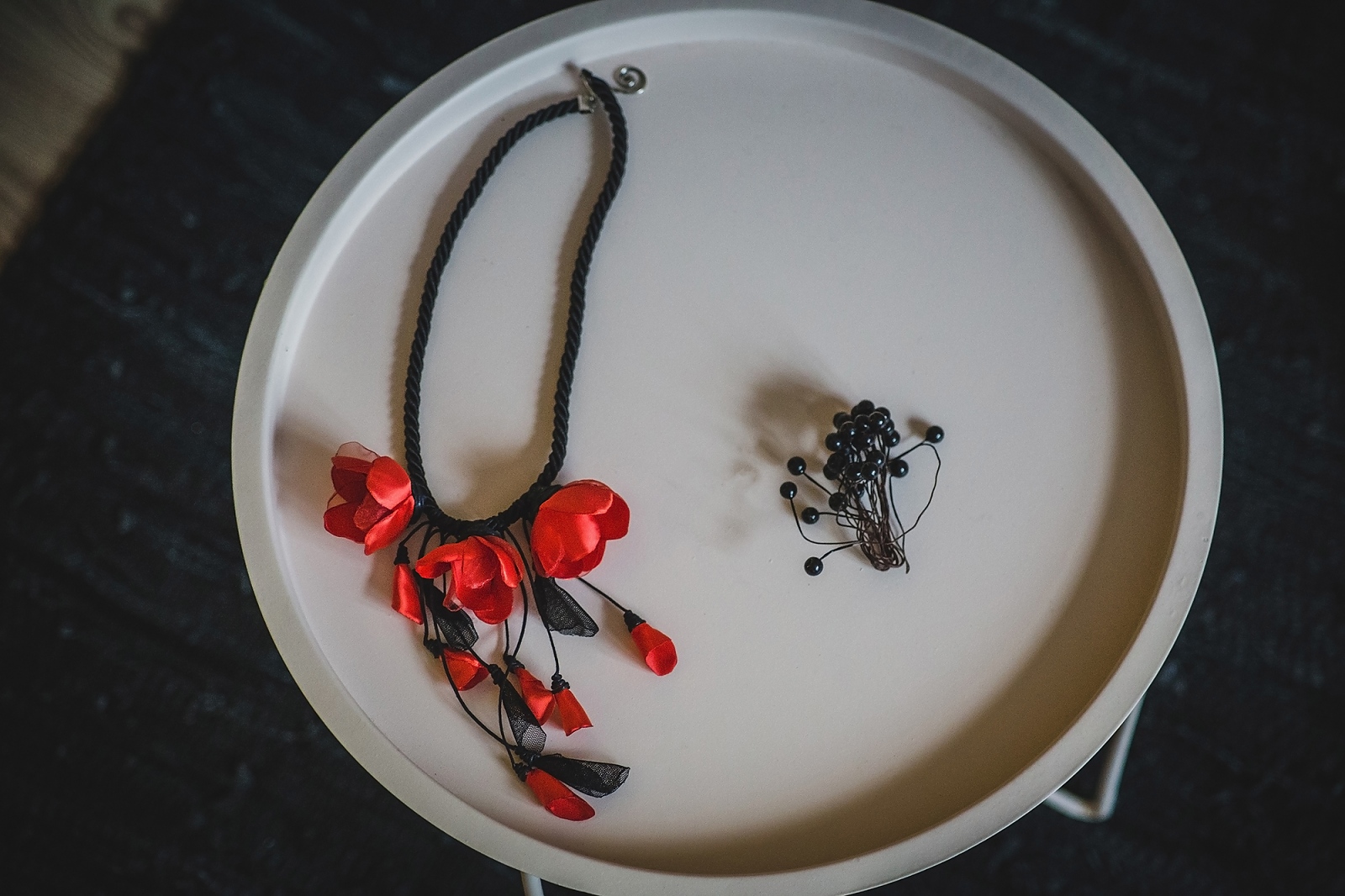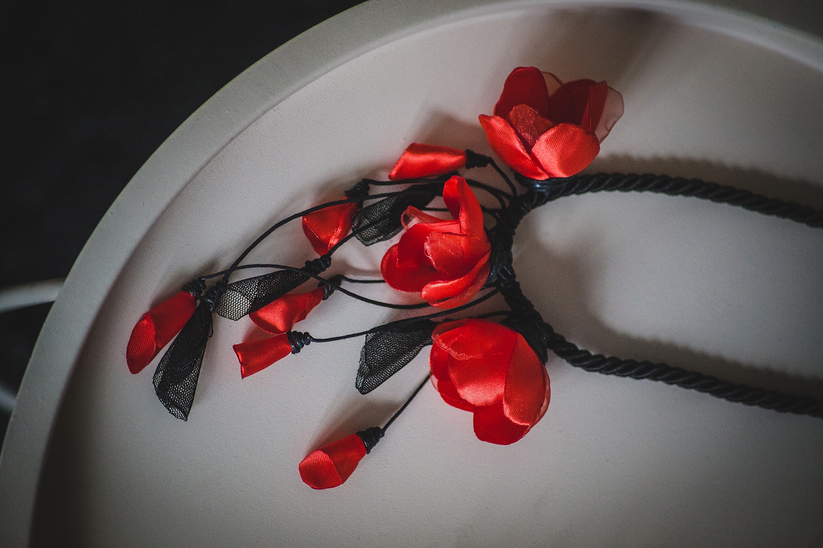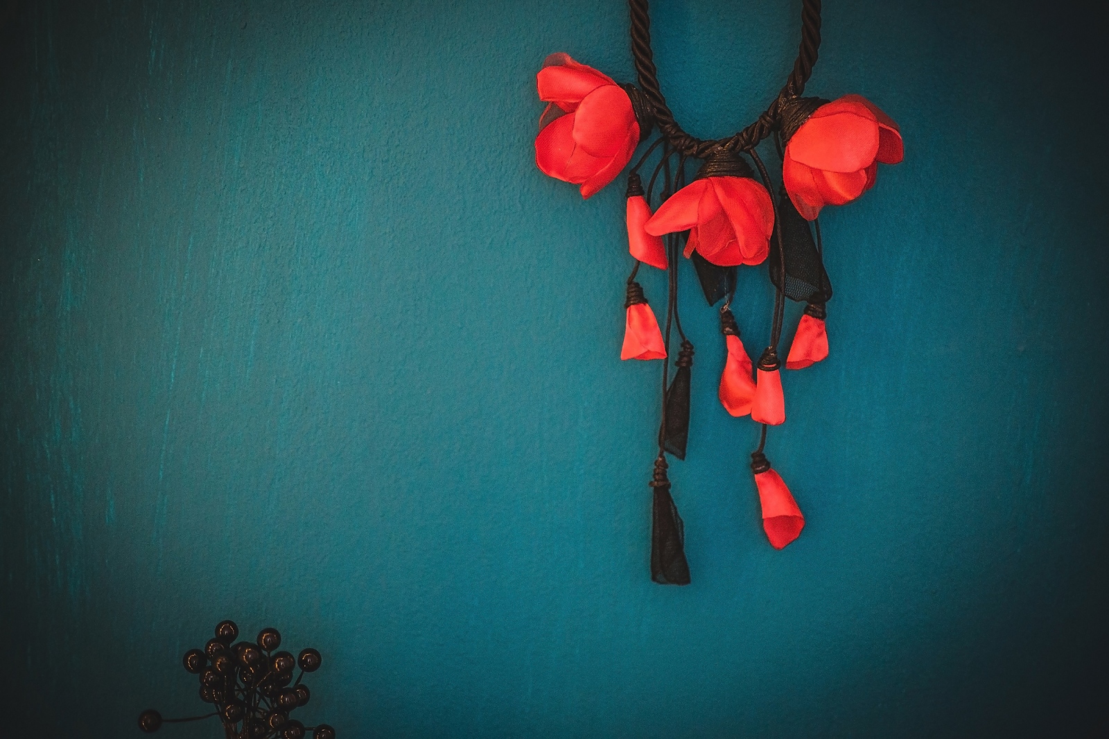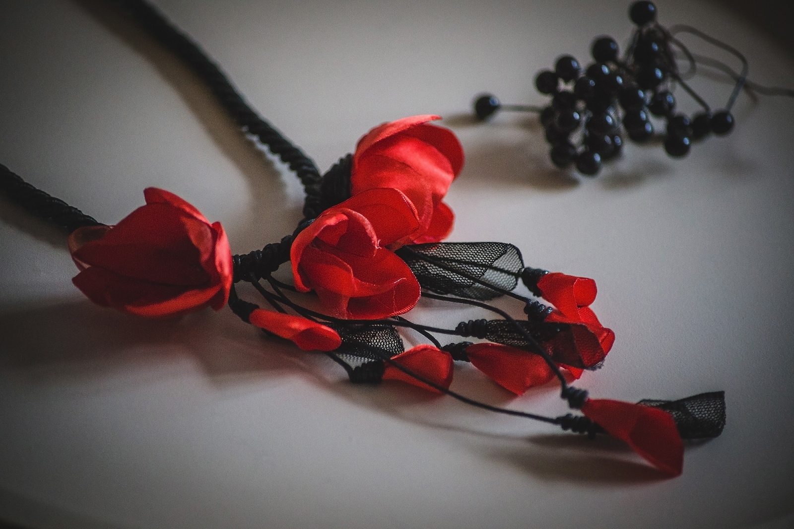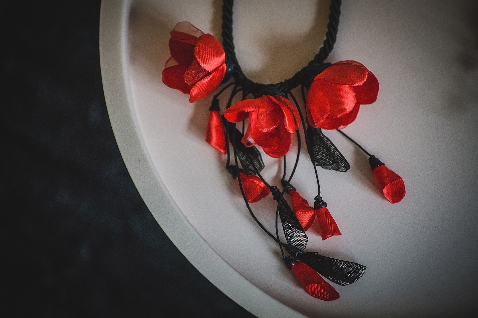 Стилно и очарователно, това ръчно изработено колие съчетава черна основа и нежни цветя с различна големина в ярък червен цвят. Класическата комбинация на червено и черно и този път няма да ви изневери.